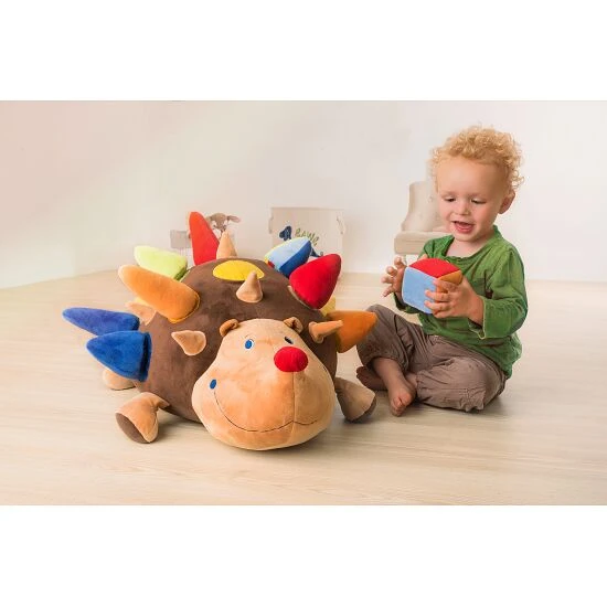 Wenn Sie mit der Hand über den Sinnesigel „Oscar“ streichen, spüren Sie seine samtig weiche Oberfläche. Der Rücken ist stachelbewehrt, aber die Stacheln des Sinnesigels sind ebenfalls samtweich und Sie können diese abnehmen. Beim Drücken erzeugen die verschiedenfarbigen Stacheln ein sanftes Rassel- oder Quietschgeräusch. Das angenehm softe Material, die bunten Farben und lustigen Geräusche sprechen den taktilen, visuellen und auditiven Sinn der Kinder an.