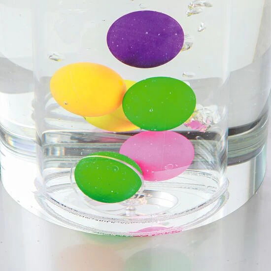 Bei der freistehenden Bläsensäule mit Bällchen werden viele kleine, bunte Bälle durch Luftblasen in einer inneren Säule durch einen Luftstrom nach oben befördert. Am oberen Ende fallen sie über den Rand in die äußere Säule und schweben wieder nach unten. Die freistehende Blasensäule mit Bällchen bietet einen entspannenden Effekt.