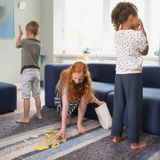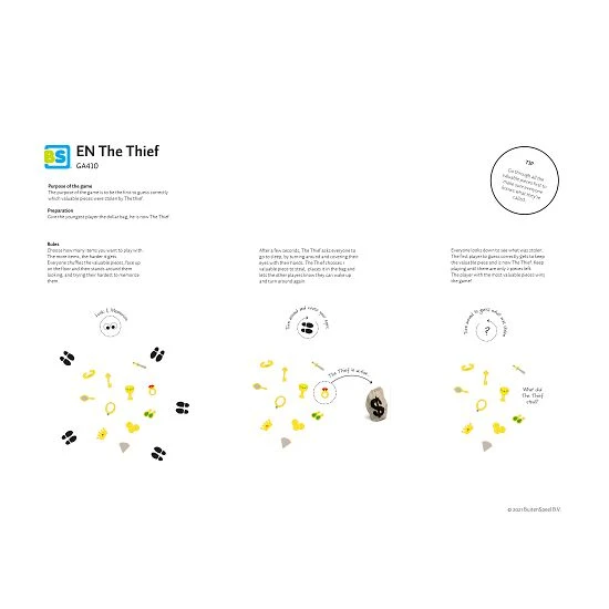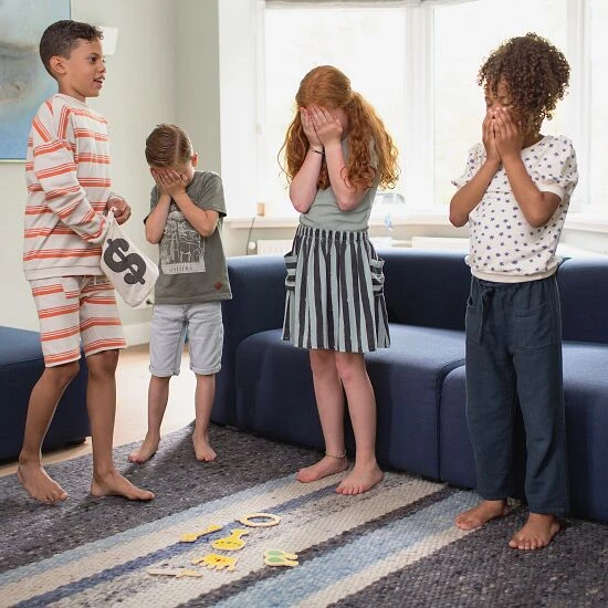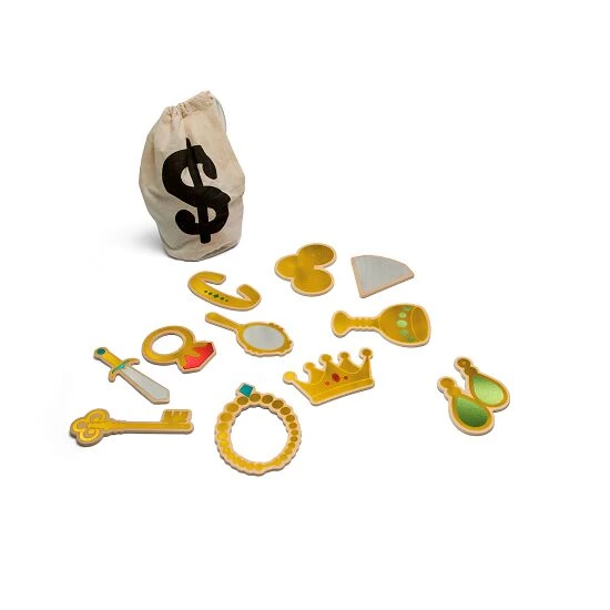 Das Gedächtnisspiel „Der Dieb“ von BS Toys bereitet Kindern diebische Freude: Aus insgesamt 11 kostbaren Gegenständen wird eine bestimmte Anzahl ausgewählt. Je geringer die Anzahl der Wertgegenstände, desto leichter lassen sich diese merken. Dann wird der Dieb bestimmt – das ist der Jüngste der Spielenden. Er fordert alle auf, „schlafen zu gehen“ – die anderen drehen sich um und halten sich die Augen zu. Der Dieb nimmt sich ein Stück und steckt es in den Diebesbeutel. Dann gibt er das Zeichen zum Umdrehen. Die anderen Kinder schauen, was gestohlen wurde. Wer es richtig errät, darf die Kostbarkeit behalten und ist der nächste Dieb. Gespielt wird, bis nur noch 2 Stücke übrig sind. Wer die wertvollsten Stücke besitzt, gewinnt.