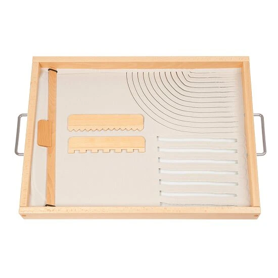, mit Boden aus Einscheiben-Sicherheitsglas; 1 Sandschieber zum Glätten, 2 Sandrechen zum Anfertigen von Mustern, 1 kg feiner Quarzsand.