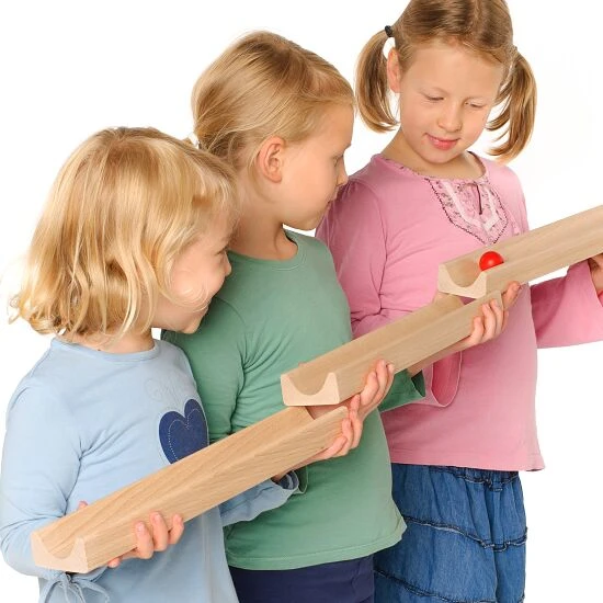 Mit der Erzi Teambahn kommt Freude auf: Die einzelnen Mitspieler müssen mit den 8 hölzernen Kugelbahn-Elementen eine Bahn bauen, während die farbige Holzkugel rollt. Die Kugelbahn muss von den Spielern immer wieder verlängert werden. Denn Ziel ist es, dass die Kugel in der Bahn rollt und nicht zu Boden geht. Dafür ist gegenseitige Abstimmung unerlässlich. Um die Herausforderung zu steigern, kann die Zahl der Bahnelemente reduziert werden.