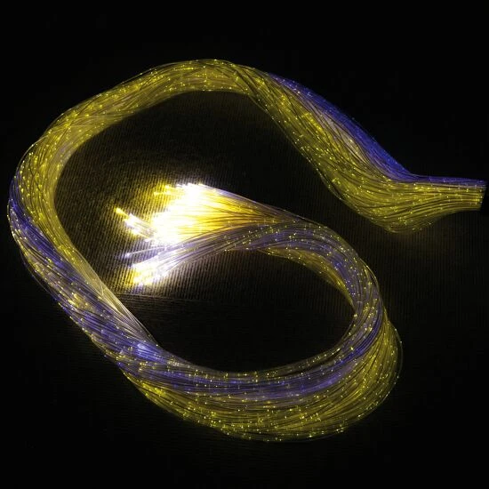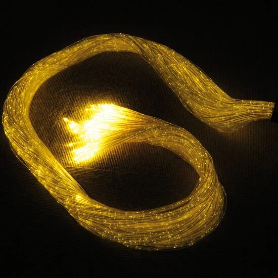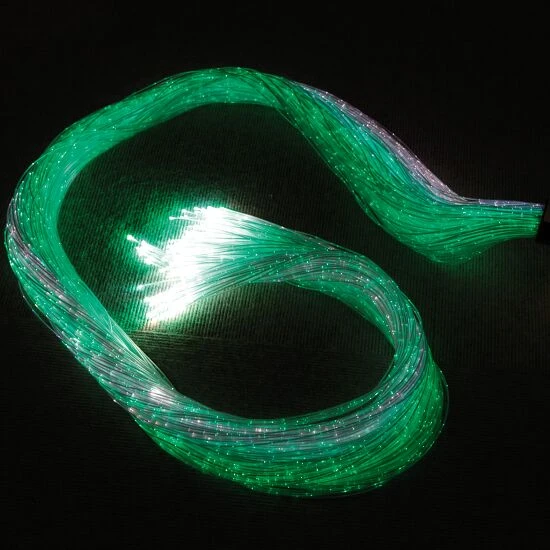 Bei den Faseroptik-Strängen mit Glasfasern wird das Licht der Lichtquelle ohne Streuverlust durch die Fasern geleitet. An den „Knickstellen“ tritt das durchgeleitete Licht aus und erzeugt so hunderte von kleinen Lichtpunkten.