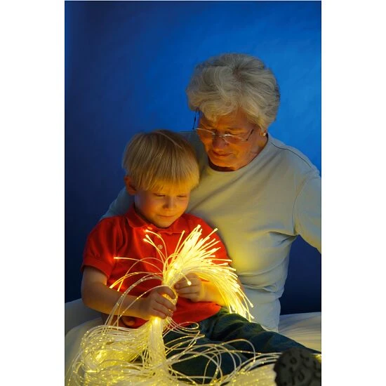Die Faseroptikstränge werden mittels eines speziellen Lichtprojektors zum Leuchten gebracht und entfalten durch Farbwechsel ihre besondere Wirkung. Setzen Sie Kammleisten oder Eckelemente für Faseroptik-Stränge ein, um einen Flächeneffekt, oder durch die Farbwechsel einen faszinierenden Wasserfalleffekt zu erzeugen. Im Snoezelenraum bieten die Faseroptik-Stränge visuelle Stimulation, wenn sich die Lichteffekte auf den Händen oder der Bekleidung abzeichnen. Dabei können die leuchtenden Fasern mit den Händen gefühlt und erforscht werden.