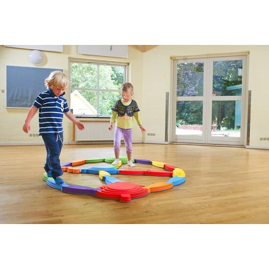 Die Balancierstrecke „Fluss-Landschaft“ ist eine Herausforderung für Kinderfüße, um auf dem der Strecke im Gleichgewicht zu bleiben. Die bunten Bausteine können Sie als Spielelemente und für den Kindersport einsetzen. Schulen Sie spielerisch das vestibuläre System der Kids – sei es in der Kitas, im Kindergarten, der Grundschule oder im Sportverein beim Kindersport. Setzen Sie die vielseitige Balancier-Strecke in der Therapie in der Arbeit mit Kindern mit Einschränkungen ein oder für Übungen innerhalb der Körperwahrnehmung mit Personen jeder Altersklasse. In Senioreneinrichtungen können Sie den Balance-Parcours für Übungen innerhalb der Sturzprophylaxe einsetzen.