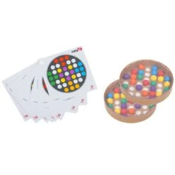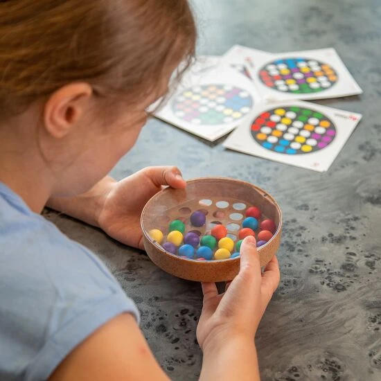 Das Motorikspiel „Easy Tip Nature“ besteht aus 2 runden Spielboxen mit einer durchsichtigen Abdeckung, 24 Spielkugeln in 6 Farben, Spielkarten aus Karton und 1 Leinenbeutel. Spielboxen, Kugeln und die Abdeckung der Boxen bestehen aus Bio-Kunststoff.