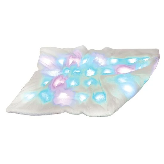 Die magische Lichterdecke besteht aus einem weichem PolyesterPolyester ist eine sehr pflegeleichte Kunstfaser. Schnell trocknend und besonders reißfest.-Gewebe. Im Inneren der Decke befinden sich LEDs, die mit einem Schalter an- und ausgestellt werden können. Die Stromversorgung erfolgt über 3 AA-Batterien, die nicht mitgeliefert werden. Die LEDs bieten Ihnen 2 Vorteile – sie verbrauchen wenig Strom und erzeugen kaum Wärme. Die magische Lichterdecke lässt sich bei 30 °C waschen.