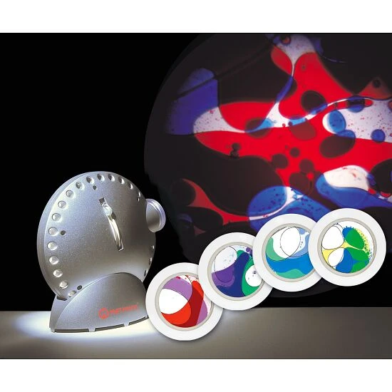 Beim Mathmos Space-Projektor-Set wirft der Lichtprojektor einen farbigen verlaufenden, harmonischen Lichteffekt an die Wand. Das Set besteht aus dem kompakten Mathmos Licht Projektor „Space“ und einem 4er Set Flüssigkeits-Effekträder in den Farbkombinationen Blau-Gelb, Blau-Grün, Rot-Violett und Violett-Grün. Die Effekträder können Sie einfach wechseln. Bitte achten Sie darauf, dass der Projektor vor einem Wechsel etwas abkühlt. Der Projektor arbeitet nahezu geräuschlos. Je näher der Projektionsabstand zur Wand ist, umso kleiner ist das Projektionsbild. Der optimale Abstand beträgt je nach Raumgröße zwischen 3 und 5 Meter.