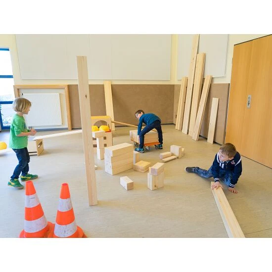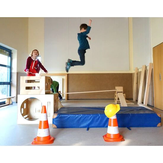 Aus den Bausteinen lassen sich verschiedenste Aufbauten für Bewegungsspiele gestalten, z.B. Türme, Wege oder Hindernisse. In Kombination mit den „Fritid“ Basis-Elementen und Brettern entstehen Auf- und Abhänge und Verbindungen wie Brücken, Stege, Hühnerleitern, Rutschen oder Rampen. Auch bereits vorhandenes Material – wie Bälle, Tücher, Decken oder Kissen – lässt sich hervorragend ins bewegte Rollenspiel integrieren. Mit dem Fritid Bewegungsparkour sind die Gestaltungsmöglichkeiten unbegrenzt.