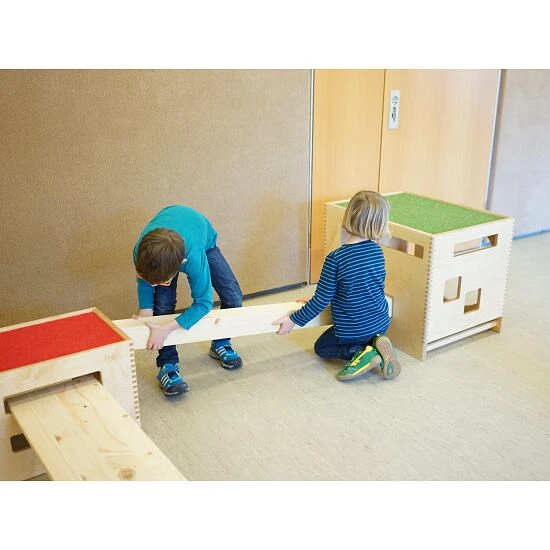 Die Einsatzmöglichkeiten der Elemente sind vielfältig. In Kombination mit Brettern und Kanthölzern lassen sich verschiedenste Auf- und Abhänge gestalten. Beim Überwinden von Brücken, Stegen, Hühnerleitern, Rutschen oder Rampen schulen die Kinder ihre Motorik. Auch durch die Verwendung bereits vorhandener Materialien – wie Seilen, Tüchern, Kissen, Decken oder Bällen – lassen sich die Möglichkeiten für das bewegte Rollenspiel erweitern.