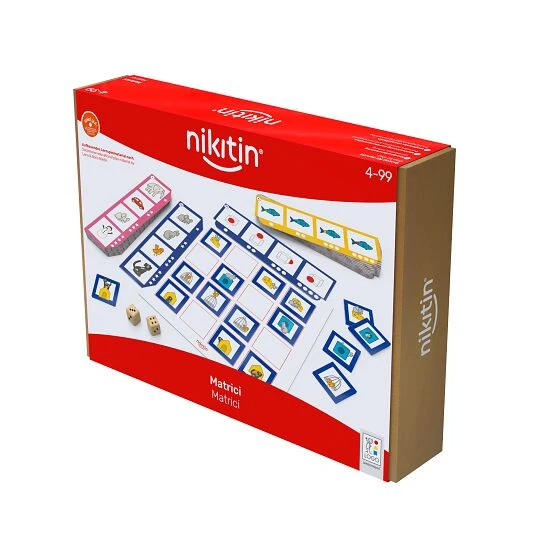 Beim Matrici N10 von Nikitin müssen die Vorgaben am oberen und linken Rand des Spielfeldes (z. B. Figuren und Mengen) miteinander kombiniert werden. Ziel ist es, das richtige Lösungskärtchen herauszusuchen und auf das entsprechende Feld zu legen. Für besonders viel Spannung sorgt die Spielvariante mit den Würfeln. Hierbei bestimmen die 2 Holzwürfel das gesuchte Lösungskärtchen und die Spieler müssen unter den aufgedeckten Lösungskarten das Richtige heraussuchen.