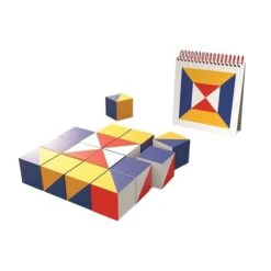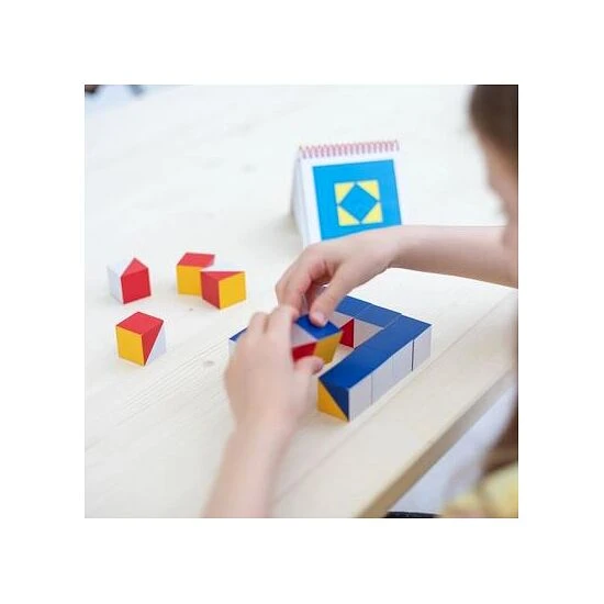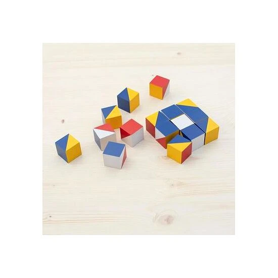 Die Musterwürfel von Nikitin bestehen aus 16 Holzwürfeln mit farbigen Flächen und 2 Musterheften. Die 6 Seiten der Würfel haben unterschiedliche Farbflächen. In den Musterbüchern sind Farbmuster in steigender Schwierigkeit vorgegeben. Diese können die Kinder nachlegen, was Konzentration und Wahrnehmung fördert. Natürlich können die Kinder auch eigene Formen legen.