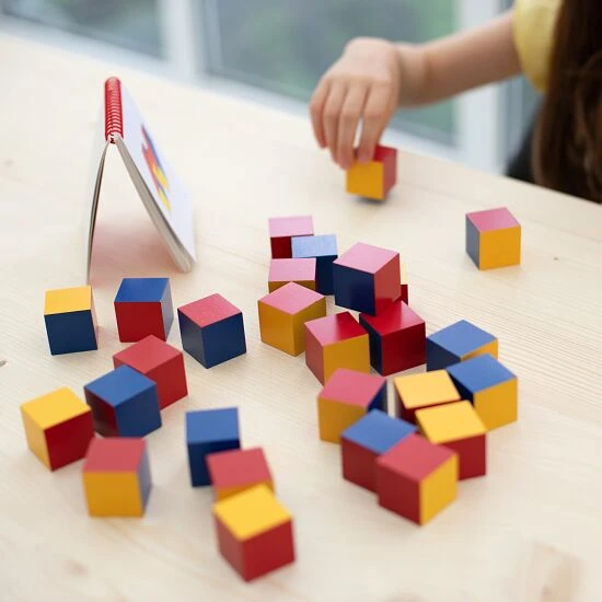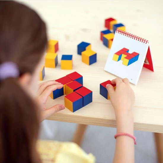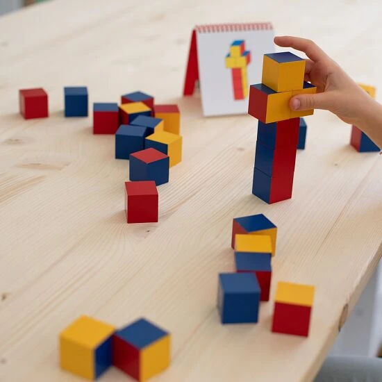 Der Uniwürfel von Nikitin besteht aus 27 Holzwürfeln mit roten, blauen und gelben Seiten. Nach Vorgabe oder Fantasie können immer neue „Bauwerke“ erstellt werden. Wer ist imstande, einen roten Turm oder eine blaue Eisenbahn zu bauen? Was auf den ersten Blick einfach erscheint, erweist sich beim Ausprobieren oft als eine knifflige Herausforderung. Wer bei den Nikitin Uniwürfeln erfolgreich sein will, muss konzentriert und aufmerksam beobachteten, um die Aufgaben zu lösen. Das Level steigert sich von Aufgabe zu Aufgabe, sodass die Kinder wieder über- noch unterfordert sind.