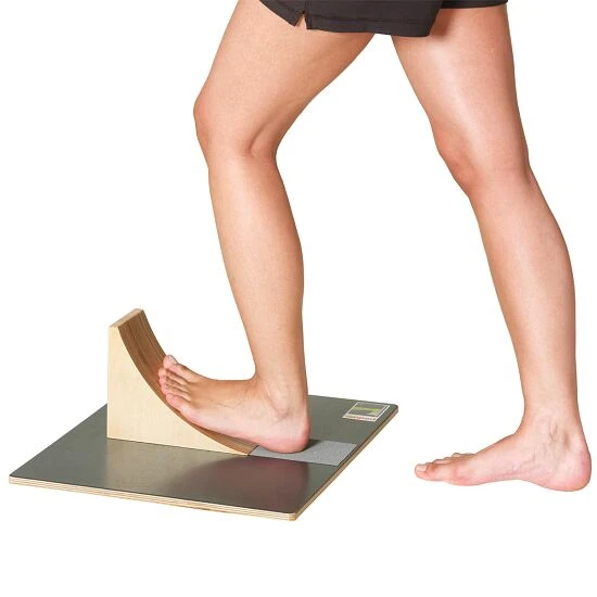 Die Pedalo Fußwerkstatt „S9 Plantardehner“ besteht aus einer stabilen Grundplatte aus CDF. Auf deren Oberseite ist ein Holzblock (Birke MultiplexMultiplex-Platten sind Furnier-Sperrholzplatten aus mindestens 5 Furnierlagen gleicher Dicke. Die Lagen sind quer zueinander verleimt, d.h. die Richtung ihrer Maserung ist von Schicht zu Schicht um 90° gedreht. Dadurch sind die Platten extrem formstabil und halten sehr hohen Belastungen stand. Verwendung: z. B. Sprungkästen, Theken, Bühnenbau, Werkbänke, Treppenbau) mit einer bogenförmig gezogenen Rampe befestigt. Transparente Anti-Rutsch-Füße sorgen für einen sicheren Stand. Den Fußtrainer betreten Sie barfuß. Dabei wird die Ferse auf die Grundplatte gesetzt. Den Fuß setzen Sie entspannt entlang der Rampe auf. Das Knie führen Sie dabei nach vorne – so bauen Sie die Dehnung auf. Die Übung führen Sie unter Belastung des Fußes aus. Gehen Sie langsam in die Dehnung rein, geben Sie nach, stärker rein gehen, nachgeben, usw.