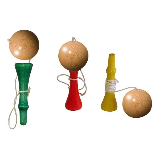Das Pedalo Geschicklichkeitsspiel „Kugelfangen“ kommt im 3er-Set daher. Jedes Spiel besteht aus einer Holzkugel mit einer Bohrung in der Mitte, einem Holzstab mit einem Spieß oben und einem Auffangteller unten. Die Kugel kann sowohl durch die Bohrung mit dem Spieß als auch mit dem Teller aufgefangen werden. Fänger und Holzkugel sind durch eine Schnur miteinander verbunden. Manch einer schafft es gleich beim ersten Versuch, braucht danach aber wieder einige Anläufe. Andere benötigen einige Male und schaffen es dann mehrmals nacheinander. Ohne Fleiß kein Preis.