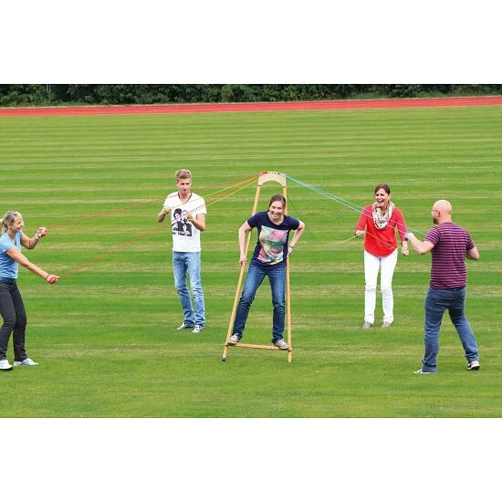 Bei dem Teamspiel „Laufendes A“ kommt es auf Teamgeist an: nachdem die Seile gespannt sind, steigt der Partner in die Mitte auf den Querbalken. Nun gilt es, das „Laufende A“ Schritt für Schritt in Bewegung zu setzen. Dafür muss sich mit den außen stehenden Partnern an den Seilen verständigt werden. Auf spielerische Art und Weise werden hier die Übernahme von Verantwortung und die Koordination in der Gruppe vermittelt. Gemeinsame Kommunikation und eine gemeinsame Strategie sind wichtig für den Erfolg der Gruppe. Das Spiel ist für spannende Gruppenspiele geeignet, da fünf Kinder zugleich beschäftigt werden. Mit 2 „Laufenden As“ können spannende „Wettrennen“ veranstaltet werden.