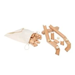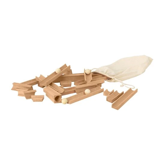 Die Kugelbahn „XL“ von Pedalo ist aus Holz gefertigt. Die Enden sind abgeschrägt, so dass Sie einfach Kurven legen können. Bei der Gestaltung der Bahn bauen die Kids einfach Gegenstände aus der Umgebung mit ein, um etwa das nötige Gefälle zu gewährleisten. In Innenräumen kann dies ein Kissen sein, im Sandkasten können die Kleinen Sand aufschütten. Die Murmeln sind bewusst aus Holz gefertigt – die Holzmurmeln in „XL“ rollen langsamer die Bahn hinunter, so dass diese besser mit den Augen verfolgt werden können.