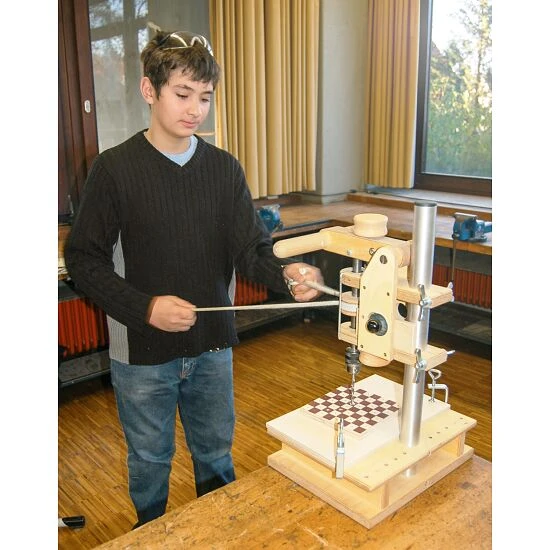 Die Bohrmaschine ist mit einem Zahnkranzbohrfutter ausgerüstet, in dem Bohrer und Werkzeuge im ø von 1-8 mm eingespannt werden können. Bei der Einstellung der Bohrtiefe können Sie sowohl eine Grobeinstellung als auch eine Feineinstellung vornehmen. Im Gehäuse befindet sich eine Zugfeder, die die Bohrspindel nach unten zieht. Beim Bohren kommt es auch auf die Kraftdosierung an: Das Seil sollte in etwa waagerecht gezogen werden. Wenn Sie die Antriebsseile schräg nach unten ziehen, können Sie die Andruckstärke des Bohrers erhöhen.