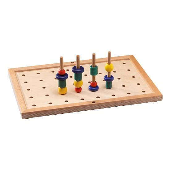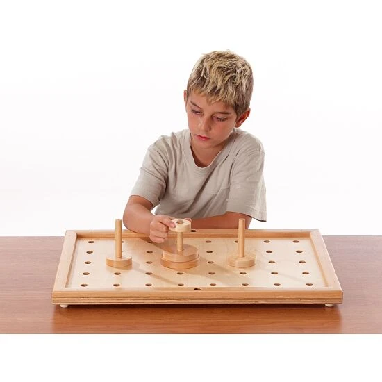 Übung 4 „Sortieren“: Das Kind soll die nach einer Größe gestapelten Scheiben auf einen anderen Stab transportieren. Dabei darf es immer nur eine Scheibe bewegen und es darf keine größer Scheibe auf einer kleineren Scheibe abgelegt werden. Die Übung fördert auch die Auge-Hand-Koordination und die Geschicklichkeit.