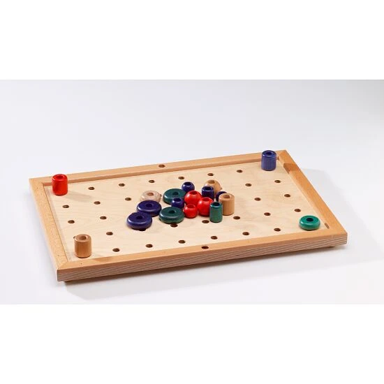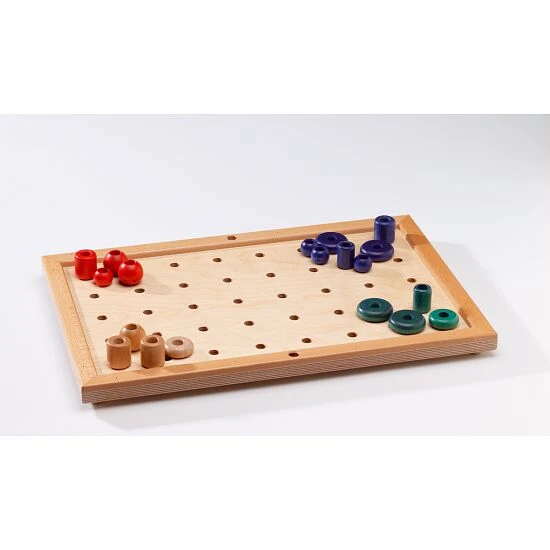 Übung 2 „Aufteilung nach Gruppen“: Auf dem Grundbrett liegen verschiedene Perlen. Das Kind erhält den Auftrag, diese Perlen in 3 Gruppen aufzuteilen. Dabei muss es zuerst das Diskriminationsmerkmal (Farbe) finden und die Perlen entsprechend zuordnen.