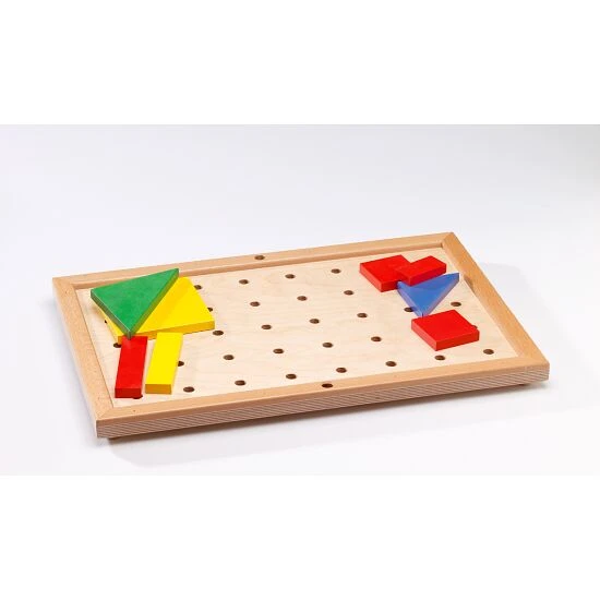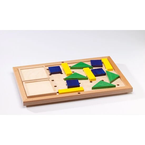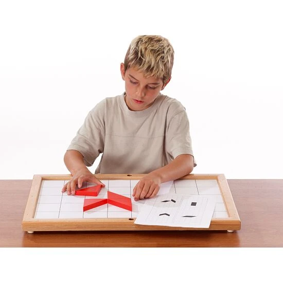 Übung 1 „Muster Nachbilden“: Auf dem Grundbrett liegt das Einlegeraster und eine darauf vorgebaute Figur. Das Kind legt aus dem bereit gestellten Teilen eine Figur nach. Dabei werden die Teilformen aus dem Gesamtbild herausgelöst (räumlich perzeptiv). 2 Schwierigkeitsstufen sind möglich: Mit und ohne Raster.