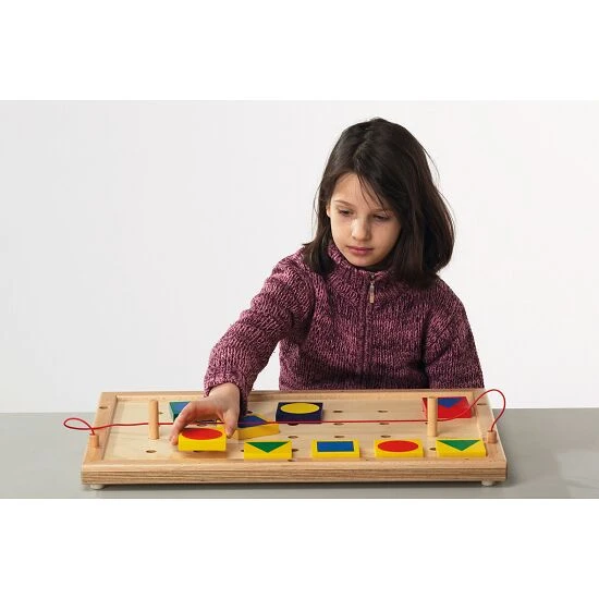 Übung 2 „Fortsetzung der Reihe“: Auf dem Grundbrett ist eine Reihe aus mindestens 4 Einlegebrettchen vorgelegt. Das Kind soll die Gesetzmäßigkeit der oberen Reihe erkennen und nun entscheiden, welches Teil die Reihe fortführt. Dabei kann sich das Kind je nach Schwierigkeitsgrad Teile aus dem vorgegebenen Pool auswählen. Mit dieser Übung wird das konvergente Denken geschult.