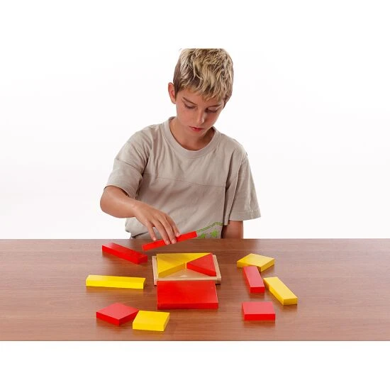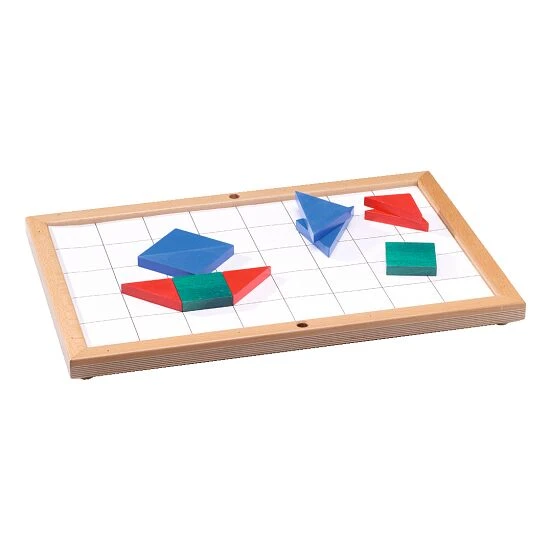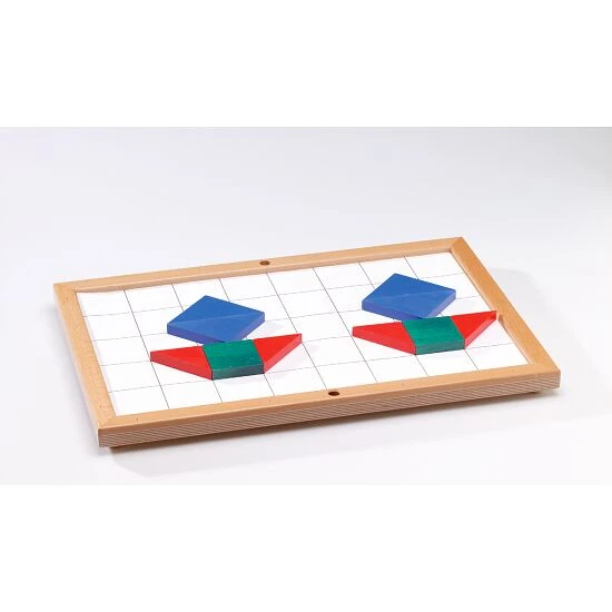 Übung 3 „Invarianz der Fläche“: Eine Fläche kann ein Darstellungsbild (Dreieck, Viereck, Quadrat) verändern, ohne seine Größe zu verändern. Der quadratische Einsatz dient dabei als Bezugsgröße. Das Kind versucht mit dem vorgegebenen Brettchen den quadratischen Einsatz zu füllen und erfährt dabei, dass die Brettchen alle ein Viertel der Bezugsgröße haben.