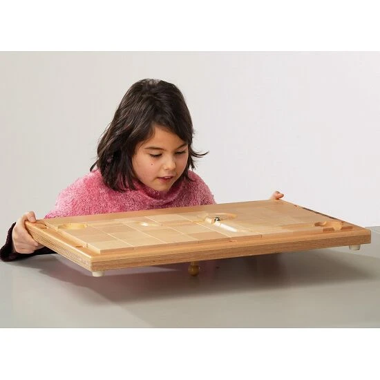 Übung 3 „Planerisch handeln“: Ein Muldenknochen liegt längs in der oberen linken Ecke und soll in die rechte untere Ecke bewegt werden. Dabei darf der Muldenknochen je Zug nur um 90 Grad um eine der beiden Kugelachsen gedreht werden. Die Holzkugeln dürfen nicht übersprungen werden. Das Kind plant Zug für Zug und macht Erfahrungen mit planerischen Vorgehen.