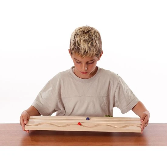 Übung 1 „Konstruktion“: Das Kind baut eine Straße nach Vorlage. Durch das Bauen erfährt das Kind die Straßenrichtung und den Straßenverlauf. Danach fährt das Kind die Straße mit dem Auto nach. Zum Abschluss transportiert das Kind die Holzkugel mit dem Auto von der Startbox zur Zielbox. Geübt wird die Auge-Hand-Koordination und die Kraftdosierung.