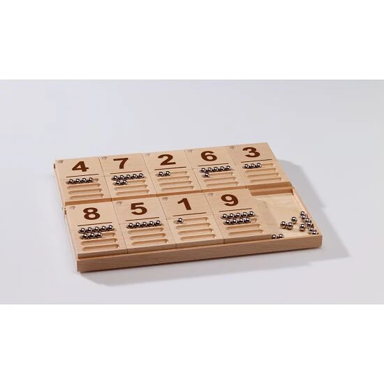 Übung 3 „Zahlenwissen“: Aufgabe zum arabischen Zahlenwissen – Im Rahmen für den Zahlenstrahl werden die Zahlen 1-9 ungeordnet eingelegt. Darunter liegen die Zahlenstrahl-Einlegeplättchen mit der Fräsung nach oben. Jetzt soll das Kind mit den Stahlkugeln die entsprechenden Mengen legen.