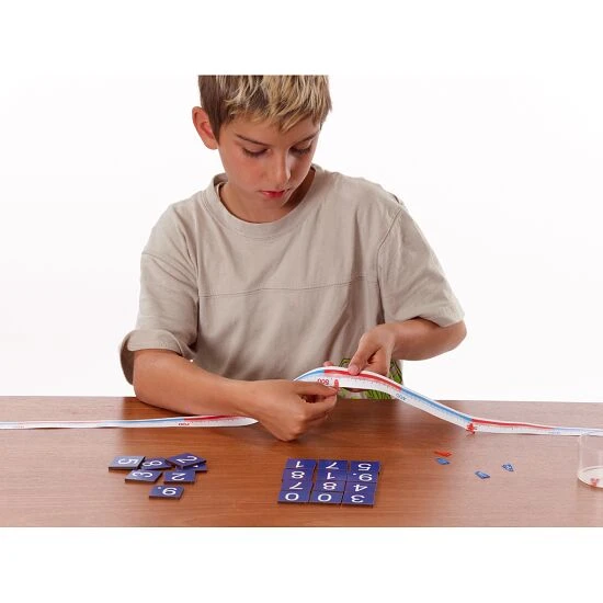 Übung 2 „Zahlenstrahl“: Die Orientierung auf einem Zahlenstrahl ist eine wichtige Voraussetzung für das Operieren mit Zahlen. Dem Kind werden die Zahlen vorgelegt (Zahlenraum bis 20 für die 1. Klasse und bis 100 für die 2. Klasse und darüber hinaus ab der 3. Klasse). Das Kind sucht die entsprechende Zahl auf dem Zahlenstrahl und markiert diese mit einer Büroklammer.
