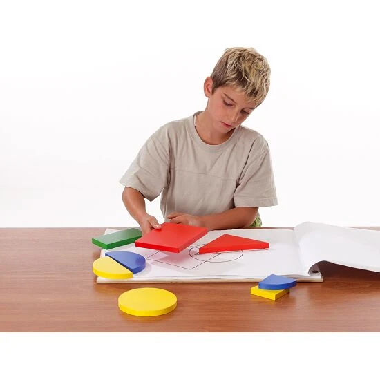 Übung 1 „Formen zuordnen: Auf einem Block sind sich überschneidende Formen aufgezeichnet. Das Kind soll die Formen aus dem Koffer zuordnen. Zunächst sind alle Formen aufgemalt. Dann liegen die Teile übereinander, Trennlinien sind jedoch noch zu erkennen. Anschließend ist nur noch der Umriss der gebildeten Form zu sehen – jetzt muss immer auf die Grundform geschlossen werden.