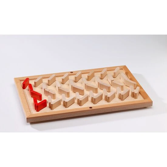 Übung 2 „Ausrichten: Auf dem Grundbrett sind die Fähnchen willkürlich eingesteckt. Jetzt werden die roten Fähnchen als Vorgabe ausgerichtet und das Kind richtet die anderen Fähnchen Zeile für Zeile danach aus. Zur Steigerung der Anforderung kann die Raum-Lage später auch diktiert werden, z.B. „Richte dein Fähnchen so aus, dass das Fahnenende nach links unten zeigt“.
