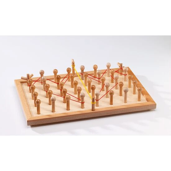 Übung 4 „Spiegeln „: Das Grundbrett ist durch eine Mittellinie in 2 Hälften unterteilt und mit Kugelbolzen bestückt. In der linken und in der rechten oberen Ecke befindet sich ein Steckrundholz mit Schlitz zum Einhängen der Gummischnur um die Kugelbolzen gespannt. Das Kind soll die Gummischnur spiegelbildlich auf der rechten Seite nachspannen.