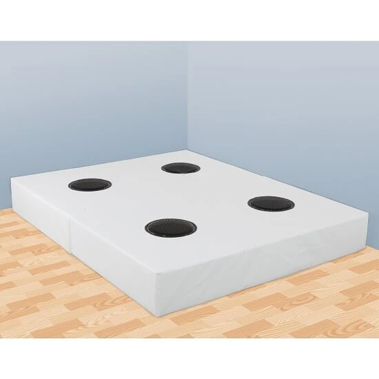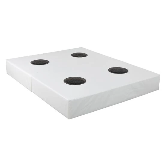 Das Rompa-Musikwasserbett lässt sich optimal in Mattenlandschaften oder mit Sitzmöbeln und Podesten für Blasensäulen kombinieren. Das eingebaute Lautsprecher-/Pulsgeber-System überträgt den Klang der Musik über den Wasserkern und macht Musik zu einem taktilen Erlebnis für den ganzen Körper. Ein passender Verstärker mit Anschlüssen für CD-/DVD-Player wird mitgeliefert. Der Bezug ist schwer entflammbar und besonders pflegeleicht – waschen Sie die Oberfläche einfach ab.