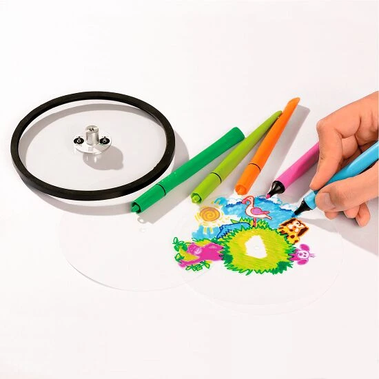 Das Blanko Effektrad wird mit 2 zugeschnittenen Spezialfolien geliefert. Die klaren Folien haben eine saugfähige Seite, auf welcher mit handelsüblichen Fasermalern gemalt werden kann. Diese erhalten Sie in jedem gut sortiertem Fachgeschäft. Wir empfehlen Ihnen hochwertige Markenprodukte zu verwenden, da die Farben durch die Projektion an der Wand schön klar und kräftig wirken.