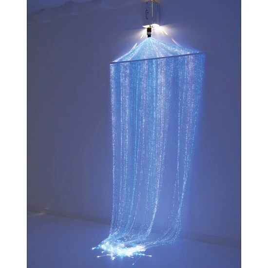 Die Kammleiste für Faseroptik-Stränge von Sport-Thieme wird an der Wand des Snoezelenraums montiert. Die Leiste hat eine Breite von 120 cm und nimmt 200 Faseroptikstränge auf. Die Stränge der Faseroptik hängen von der Kammleiste herab und erzeugen durch die entstehende Fläche einen Lichteffekt.