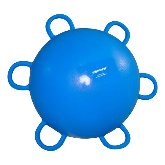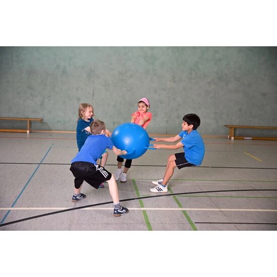 Der Ringelball von Sport-Thieme ist ein stabiler, blauer Kunststoffball. An den 6 umlaufenden Haltegriffen können Kinder nach Herzenslaune ziehen. Bis zu 6 Kinder können an dem Ball wie beim Tauziehen ihre Kräfte messen, zerren, ziehen und sich drehen oder neue kreative Spielideen entwickeln. Der Ringelball eignet sich aber auch für Gruppenspiele, bei denen alle an einem „Strang“ ziehen müssen, um sich fortzubewegen. Den Ball pumpen Sie am besten mit einem Ballkompressor auf.