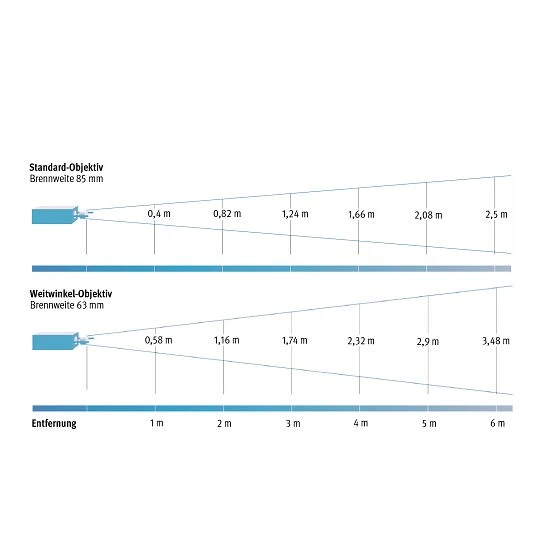 - 85 mm Standardobjektiv; bzw. 63 mm Weitwinkelobjektiv