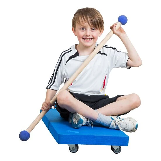 Das Sport-Thieme Rollbrett-Paddel darf bei keinem Rollbrett fehlen, denn es ermöglicht viele Bewegungsspiele und Bewegungsformen. Die Kinder stoßen sich vom Boden mit dem Paddel ab – um eine gerade Vorwärtsbewegung zu erreichen, muss sich wie beim Kajakfahren abwechselnd links und rechts abgestoßen werden. Die Muskulatur in den Armen und Rücken wird beidseitig trainiert und die Koordination gefördert. Die abriebfesten Gummikugeln rutschen nicht ab. Das ermöglicht ein kontrolliertes Fahren, z. B. durch den Sport-Thieme Spiel-Parcours.