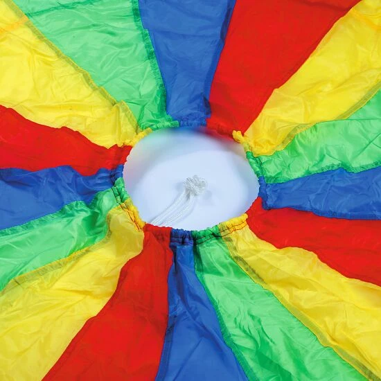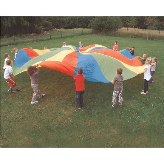 Mit seiner farbenfrohen Gestaltung ist dieser „Fallschirm“ besonders bei Kindern sehr beliebt. Ob Wellen machen, drüber laufen oder drunter verstecken, es bieten sich unzählige Möglichkeiten und die Kinder lieben die Spiele mit dem Schwungtuch. Die Griffschlaufen aus Gurtband lassen viele Mitspieler zu, so dass niemand ausgeschlossen wird. Dabei sorgt das reißfeste Material für eine lange Lebensdauer und lässt auch lebhaftes Spielen unbeschadet überstehen. Die Kinder verbessern mit dem Schwungtuch mit Griffschlaufen spielerisch Koordination und Rhythmusgefühl, während zusätzlich Teamfähigkeit trainiert wird.