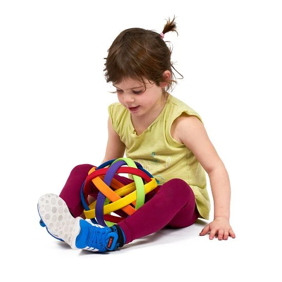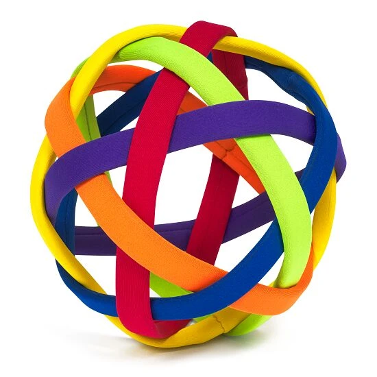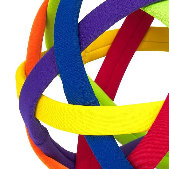 Der Ball ist aus flexiblen Kunststoffstreifen mit Gewebeüberzug gefertigt, die ineinander verflochten sind. Der Kunststoffüberzug sorgt für eine angenehme Haptik, die Öffnungen für ein tolles Greiferlebnis. Das flexible Material lässt sich auch sehr gut drücken, ohne dabei zu brechen. Außerdem ist der Ball per Handwäsche waschbar bei 30° C.
