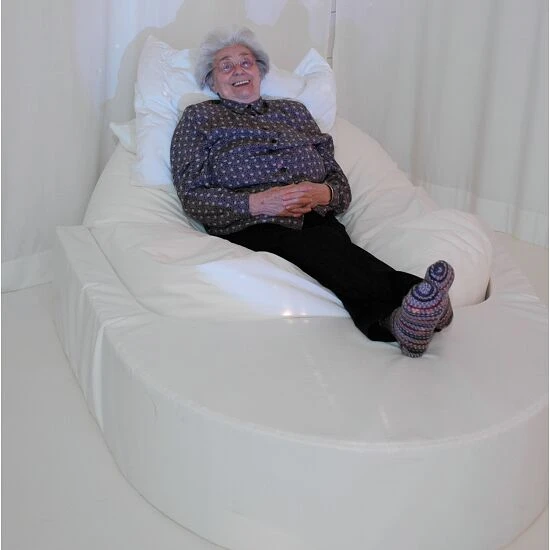 Spezialanfertigung zur Erweiterung der Einsatzmöglichkeiten der Musik-Sitzsäcke. Die Umrandung für den Musiksitzsack ist mit einem weißen Bezug aus schwer entflammbarem, nylonverstärktem Vinyl (71,7 % Polychlorid, 28,3 % PolyesterPolyester ist eine sehr pflegeleichte Kunstfaser. Schnell trocknend und besonders reißfest.) bezogen. Mit hochwertigem Schaumstoffkern RG 30/50. Die besondere Schaumstoffqualität sorgt dafür, dass die Benutzer sicher und ohne tiefes Einsinken weich und bequem darauf liegen können.