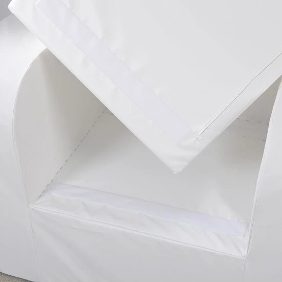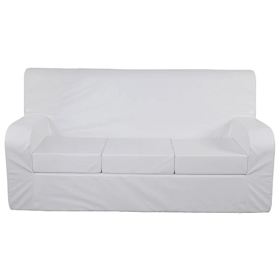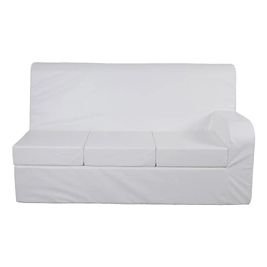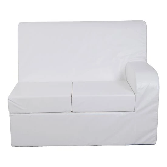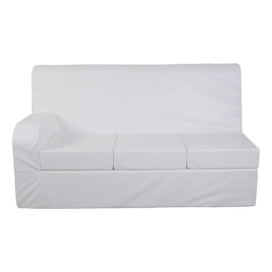Das gesamte System ist mit einem hochwertigen Schaumstoffkern RG 30/50 und Seitenlehnen RG 33/60 ausgestattet. Die weißen Bezüge bestehen aus schwer entflammbarem, nylonverstärktem Vinyl (71,7 % Polychlorid, 28,3 % PolyesterPolyester ist eine sehr pflegeleichte Kunstfaser. Schnell trocknend und besonders reißfest.). Für mehr Stabilität ist die Sitzgrundfläche mit einer 8 mm Holzplatte unterlegt.