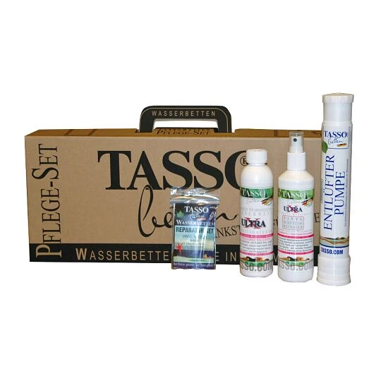 Der Tasso Pflegekoffer für Wasserbetten enthält: Tasso Wasserconditioner Ultra X , Tasso Vinyl-Reiniger, eine Entlüfterpumpe, einen Entleerungsstutzen, ein Reparaturset und einen 110 cm Korrekturschlauch. Damit sind Sie für die Pflege eines Wasserbettes gut ausgestattet.