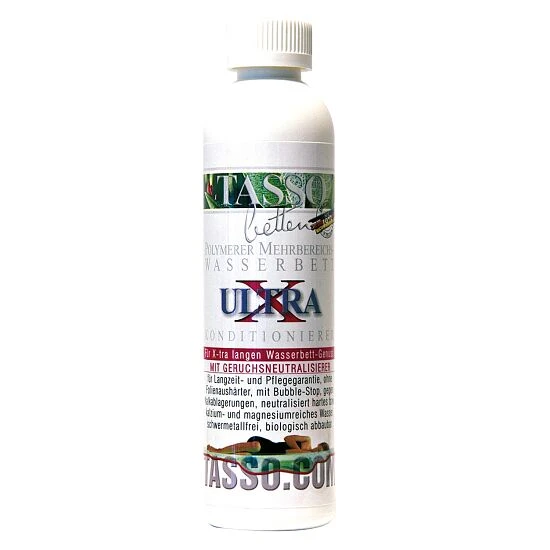 Der Tasso Wasserbett Conditionierer „UltraX“ ist eine einzigartige Doppel-Polymer Rezeptur, stark vinylschützend, und sich im Wasserkern schnell verteilend. Sie reinigt den Wasserkern von innen durch Neutralisierung aller schädlichen Mineralien. Hält das Wasser in Ihrem Wasserkern ca. 1 Jahr lang frisch.