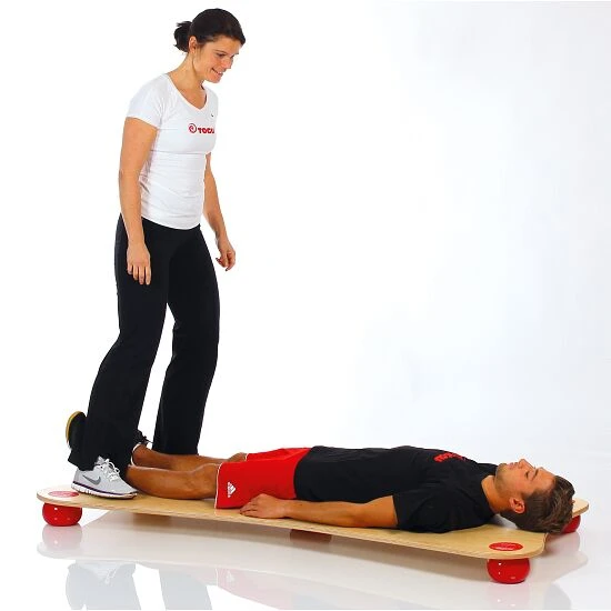 -Brett, das schwimmend auf extrem robusten, 5 luftgefüllten Bällen gelagert ist. Diese besondere Konstruktion verleiht dem Trainingsgerät eine dynamische Instabilität. Der Körper versucht instinktiv die Instabilität auszugleichen, indem er über die stabilisierenden Muskeln der Gelenke gegensteuert. Die Tiefenmuskulatur, die mit herkömmlichen Übungen nicht angesprochen werden kann, wird intensiv trainiert und der Effekt sensomotorischer Übungen zusätzlich verstärkt. Ob Teamübungen mit dem Trainingspartner oder psychomotorische Übungen von Patienten mit Unterstützung von Therapeuten – die großzügige Trainingsfläche bietet Ihnen viel Platz für einen festen Stand und sichere Übungsausführungen. Der Ballstep XXL eignet sich daher sehr gut für den Einsatz in der Therapie und der Gangschule sowie für den Einstieg in das sensomotorische Training und zur Steigerung von allgemeiner Fitness- und Koordination.