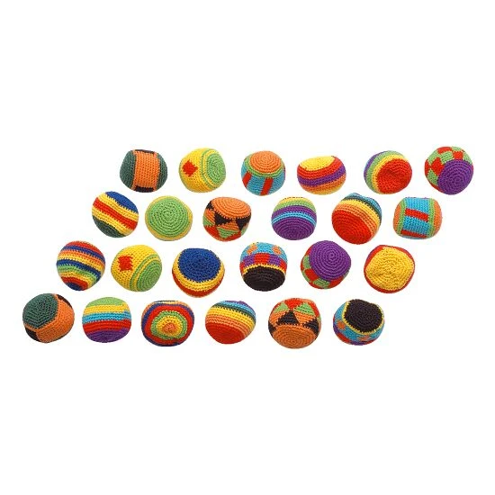 Mit den Kick-Bällen kommt bestimmt keine Langeweile auf. Die bunten Bälle im 24er Set kommen im bunten Rasta-Look daher. Das Obermaterial besteht zu 100 % aus BaumwolleBaumwolle ist eine hautfreundliche Naturfaser. Vorteile: strapazierfähig und leicht zu pflegen. und ist mit festen Maschen in Spiralrunden gehäkelt. Gefüllt sind die Spaßbälle mit einem GranulatEin Gemisch aus festen Partikeln des jeweiligen Materials, wie z.B. Körnern oder Kugeln. Verwendung vor allem als Füllmaterial.. Durch diese Granulatfüllung springen die Bälle nicht – ideal also, um die Bälle mit den Füßen zu kicken und wieder mit dem Fuß zu stoppen und aufzufangen. Ein Tipp: Die bunten Kickbälle können im Schonwaschgang gewaschen werden.